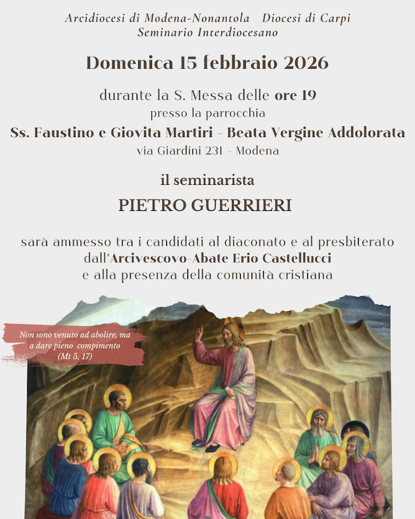 Domenica 15 febbraio, durante la Santa Messa delle ore 19, presso la parrocchia dei Santi Faustino e Giovita Martiri – Beata Vergine Addolorata a Modena (via Giardini 231), il seminarista Pietro Guerrieri sarà ammesso tra i candidati al diaconato e al presbiterato dall’arcivescovo monsignor Erio Castellucci, alla presenza della comunità cristiana.