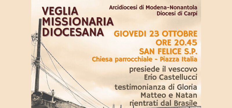 La Veglia missionaria costituisce il fulcro di tutte le attività di animazione dell’Ottobre Missionario. L’edizione 2025 dal titolo: “Missionari di Speranza tra le genti” è stata pensata e realizzata in sinergia tra l’Arcidiocesi di Modena-Nonantola e la Diocesi di Carpi. La novità di quest’anno è che la celebrazione interdiocesana sarà proposta in due parrocchie differenti. La prima si svolgerà presso la chiesa parrocchiale di San … Continua a leggere