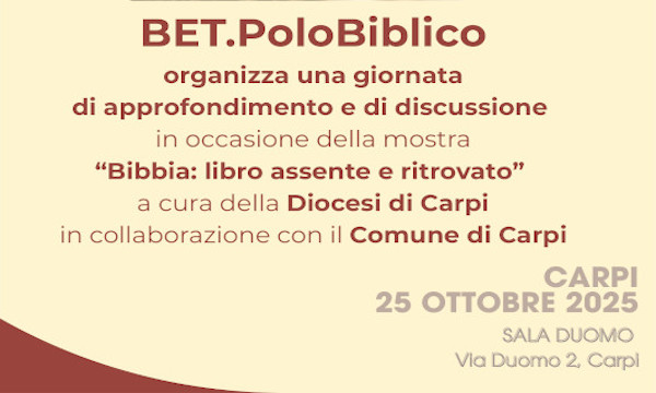 È stata presentata in anteprima, nella mattinata di martedì 16 settembre, presso il Museo Diocesano a Carpi, la mostra “La Bibbia. Libro assente e ritrovato. Percorsi all’incrocio tra spiritualità e culture”. L’esposizione rientra nel programma del festivalfilosofia 2025, e sarà visitabile a partire da venerdì 19 settembre: la mostra è nata dalla collaborazione tra Diocesi e Comune di Carpi – con il sostegno della Fondazione … Continua a leggere »