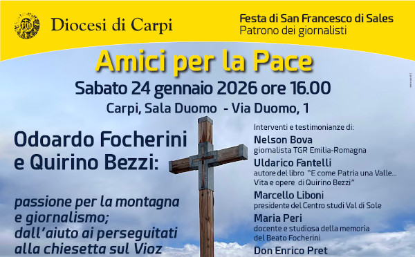 “Amici per la pace”: Focherini e Bezzi e i monti della Val di Sole, sabato 24 gennaio, dalle 16, in Sala Duomo a Carpi, per la festa del patrono dei giornalisti “Odoardo Focherini e Quirino Bezzi: passione per la montagna e giornalismo. Dall’aiuto ai perseguitati alla chiesetta sul Vioz”: sono loro gli “Amici per la Pace” di cui si parlerà sabato 24 gennaio a Carpi … Continua a leggere »