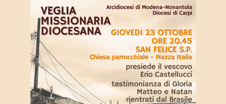 La prima si svolgerà presso la chiesa parrocchiale di San Felice sul Panaro (piazza Italia), giovedì 23 ottobre, alle 20.45, e sarà presieduta dal vescovo Erio Castellucci. La Veglia, che sarà animata dalla parrocchia di San Felice, segnerà anche l’inizio delle Missioni Popolari di quella unità pastorale.