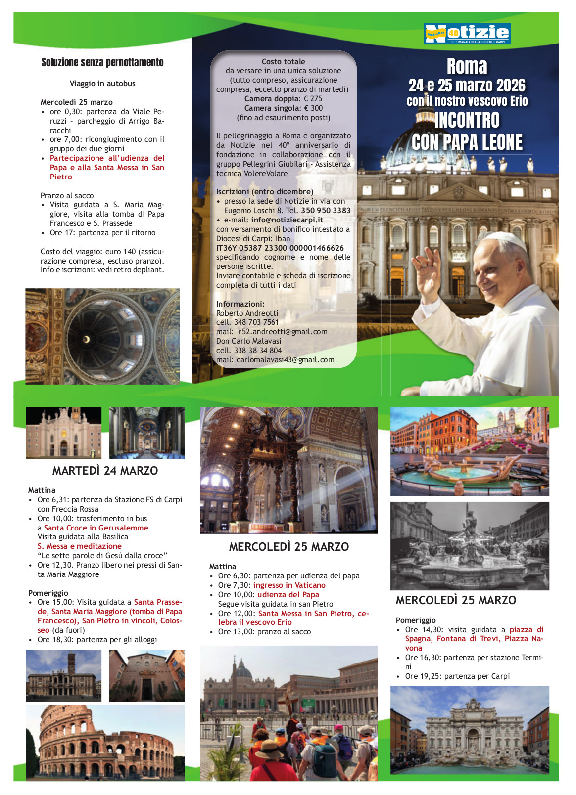 Il pellegrinaggio a Roma è organizzato da Notizie che celebra il 40º anniversario di fondazione in collaborazione con il gruppo Pellegrini Giubilari – Assistenza tecnica Voler Volare.
