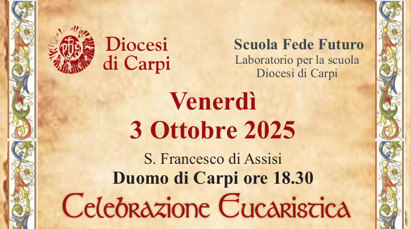 Venerdì 3 ottobre, vigilia della festa di San Francesco d’Assisi, alle 18.30, in Cattedrale a Carpi, il vicario generale, monsignor Ermenegildo Manicardi, presiederà la celebrazione eucaristica per l’inizio del nuovo anno scolastico. Organizza Scuola Fede Futuro Laboratorio per la scuola della Diocesi di Carpi. Animazione dei canti a cura dell’orchestra della scuola Alberto Pio.