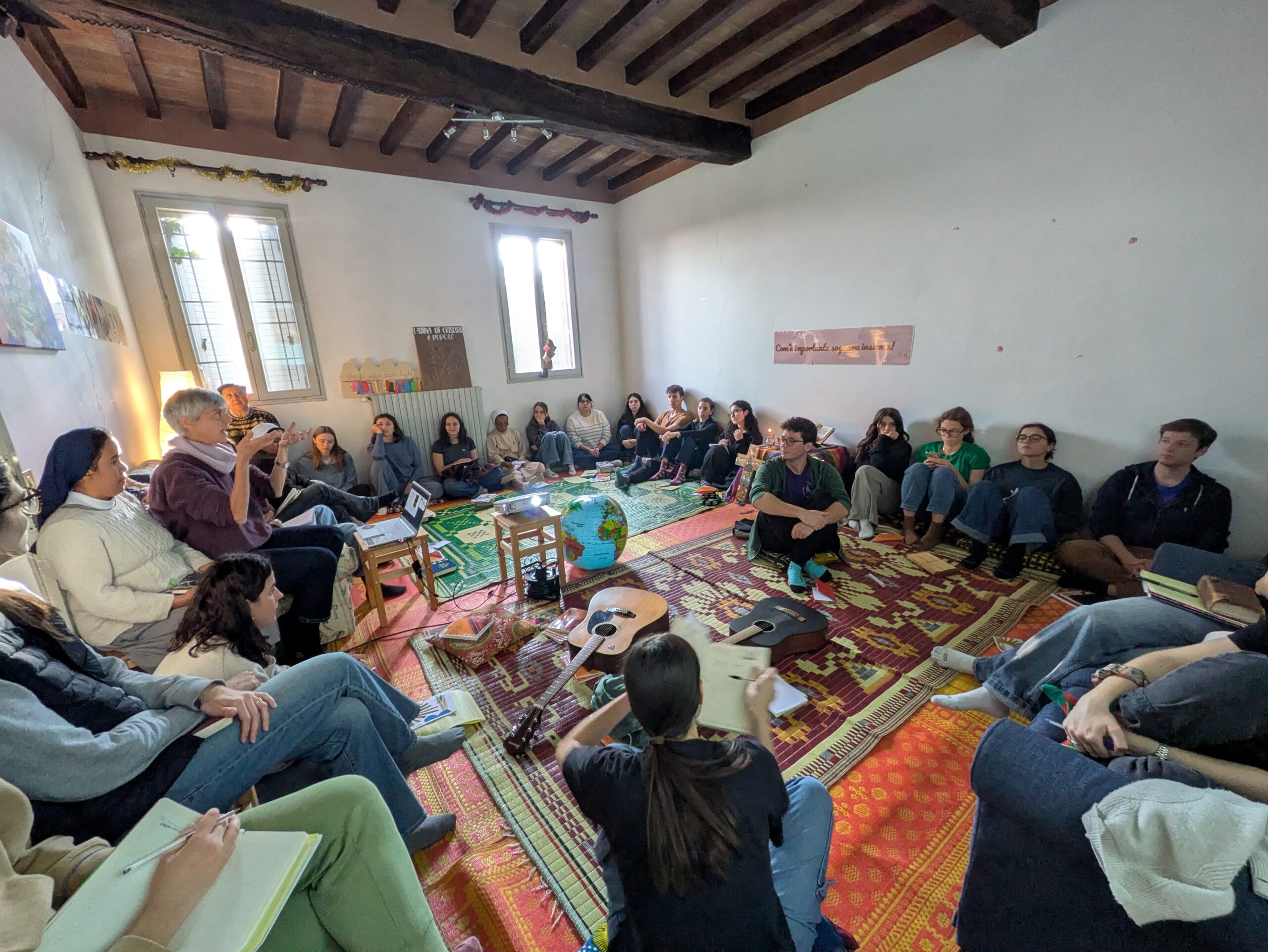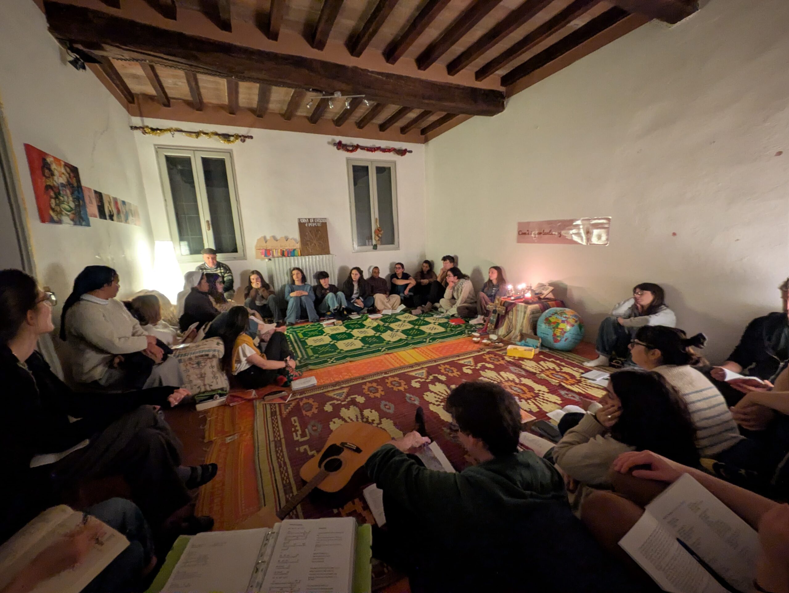 Un altro momento molto significativo è stata la veglia del sabato sera. Dopo aver ascoltato un racconto di Pumla Gobodo Madikizela sul perdono, siamo entrati in un silenzio profondo, facendo risonanza sul testo appena letto. Subito dopo ci è stata posta una domanda: Quale luce voglio tenere accesa dentro di me in questo cammino? Ognuno ha condiviso la propria luce e, come gesto simbolico, abbiamo messo dei pezzetti di cera in un vasetto. Da tutti questi frammenti è nata una candela che rimarrà accesa durante il percorso, segno del cammino comune che stiamo intraprendendo.