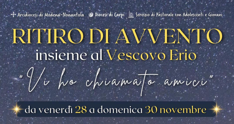 Ritiro di Avvento E’ in programma da venerdì 28 a domenica 30 novembre (dalla cena del 28 al pranzo del 30) il Ritiro di Avvento “Vi ho chiamati amici” insieme al vescovo Erio per i giovani dai 18 ai 35 anni all’Eremo di San Geminiano a Gainazzo.