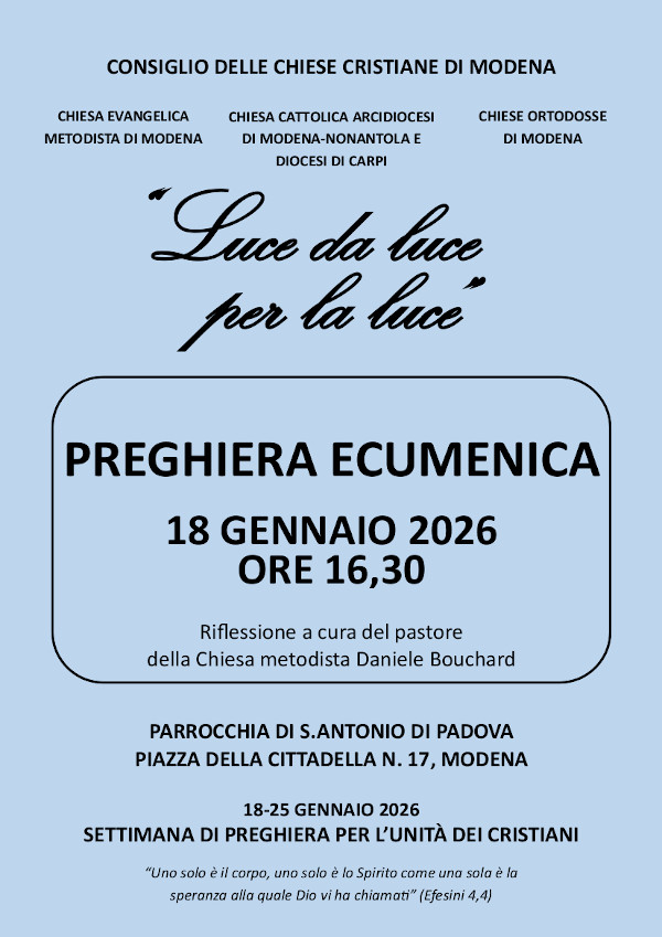 In occasione della Settimana di preghiera per l’unità dei cristiani, domenica 18 gennaio, alle 16.30, presso la parrocchia Sant’Antonio di Padova a Modena (piazza della Cittadella 17), Preghiera ecumenica “Luce da luce per la luce” organizzata dal Consiglio delle Chiese Cristiane di Modena. La riflessione sarà a cura del pastore della Chiesa metodista Daniele Bouchard. Tutti sono invitati a partecipare.