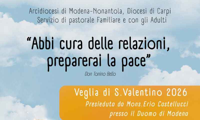 Sabato 14 febbraio, alle 21, nel Duomo di Modena, l’arcivescovo Erio Castellucci presiederà la Veglia interdiocesana di San Valentino dal titolo “Abbi cura delle relazioni, preparerai la pace”. Sono invitate a partecipare le coppie di fidanzati. Organizza il Servizio interdiocesano di pastorale familiare e con gli adulti.
