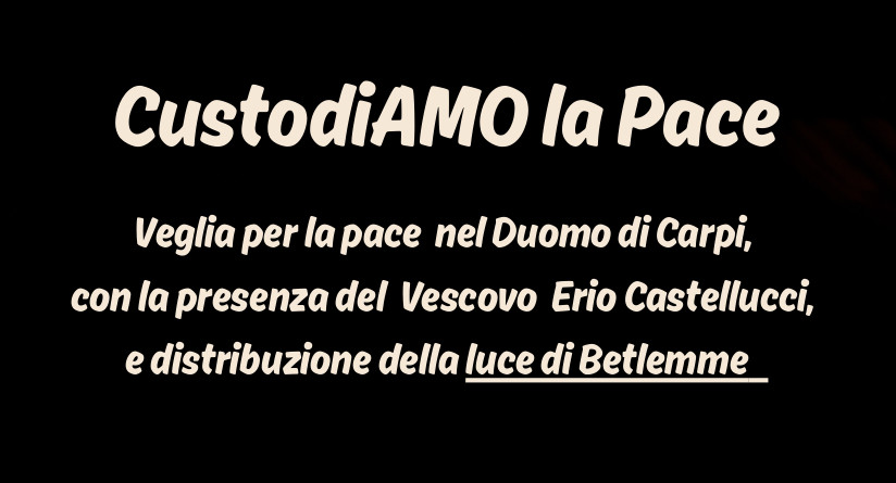 Veglia per la pace in Cattedrale a Carpi sabato 13 dicembre, dalle 20.30. Interverrà il vescovo Erio Castellucci. Sarà esposta la Luce della Pace di Betlemme, a cura dell’Agesci e del Masci.