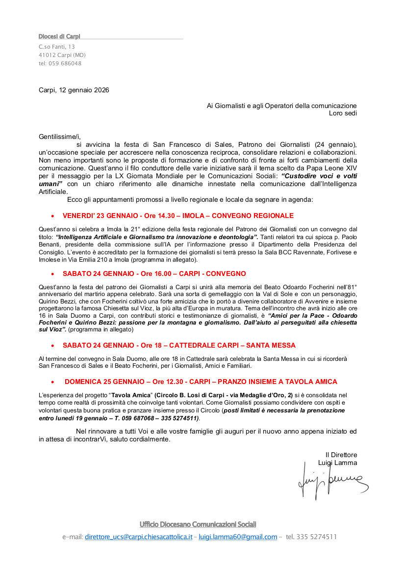 “Odoardo Focherini e Quirino Bezzi: passione per la montagna e giornalismo. Dall’aiuto ai perseguitati alla chiesetta sul Vioz”: sono loro gli “Amici per la Pace” di cui si parlerà sabato 24 gennaio a Carpi in occasione della festa di San Francesco di Sales patrono dei giornalisti. L’iniziativa promossa dall’Ufficio diocesano per le comunicazioni sociali in collaborazione con il Centro Studi della Val di Sole, punta ad esplorare il contesto delle origini trentine della famiglia Focherini e del legame particolare tra il Beato Odoardo e una figura di riferimento culturale e politica come Quirino Bezzi, del quale è uscita a novembre una corposa biografia. Sabato 24 gennaio, alle ore 16, in Sala Duomo a Carpi, si terrà un incontro con interventi e testimonianze a partire da Uldarico Fantelli, autore del libro “E come Patria una Valle…Vita e opere di Quirino Bezzi”, Marcello Liboni, presidente del Centro studi Val di Sole, Maria Peri, docente e studiosa della memoria del Beato Focherini, Nelson Bova, giornalista TGR Emilia-Romagna. Sarà presente don Enrico Pret, parroco dell’Unità pastorale Alta Val di Sole (Trento) che poi celebrerà la santa messa in Cattedrale alle ore 18, con la corale del Coro CAI di Carpi che eseguirà i canti.