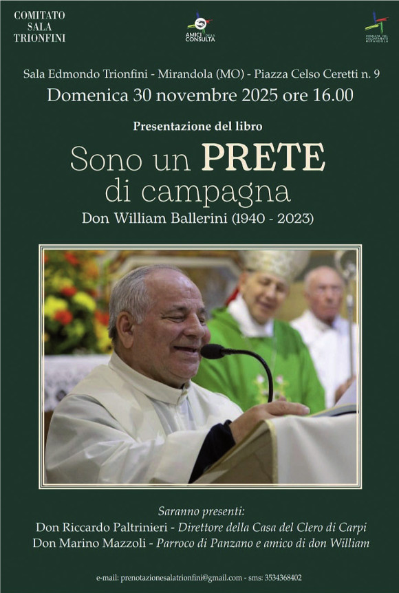 Domenica 30 novembre, alle 16, presso la Sala Trionfini a Mirandola (piazza Ceretti 9), sarà presentato il libro “Sono un prete di campagna. Don William Ballerini (1940-2023)” a cura di Gino Mantovani. Interverranno,